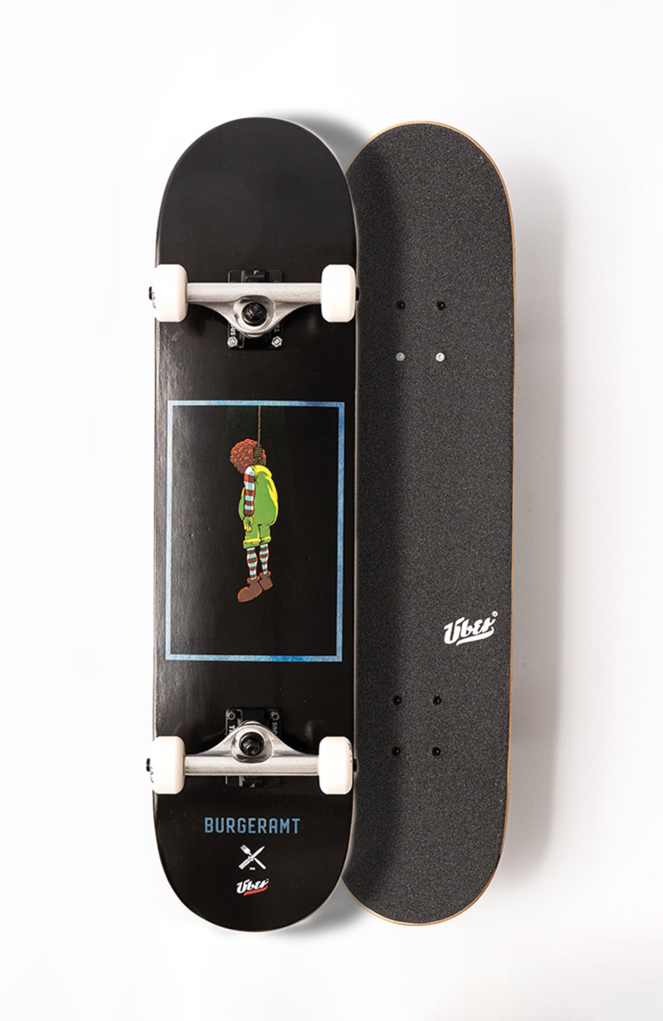 schwarzes skateboard mit hängendem Mc-Donalds Clown (Ronald) als grafik